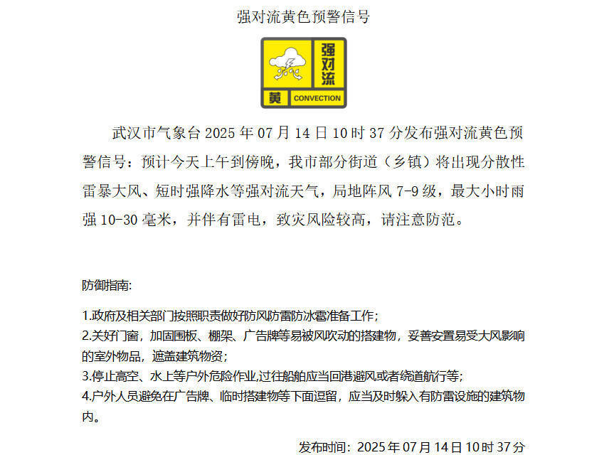 武汉发布黄色强对流预警,局地阵风将达7-9级